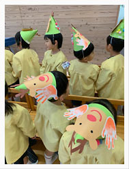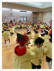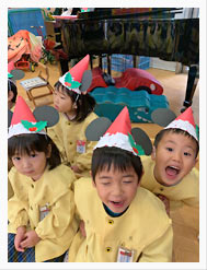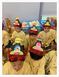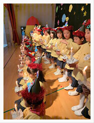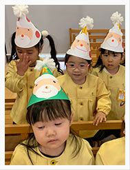 学年ごとに工夫を凝らした帽子をかぶり、歌を歌いながら待つのはサンタクロースの到着。