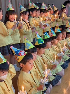 年長さんがキャンドルサービスをしていると、遠くの方から鈴の音が! 子どもたちは窓の外にサンタさんを見つけてビックリです。